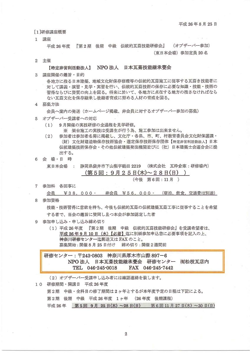 平成26年度 『第2期 中級 後期 伝統的瓦葺技能研修会』9月開催オブザーバー参加者募集のお知らせ